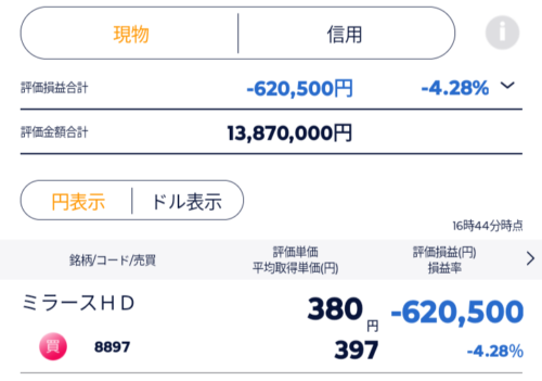 保有銘柄のミラースは金曜日だいぶ下がっていて、含み損100万に達しようとしていた。