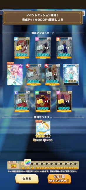 いきなりMRきた!と思ったらノアからの 10連オマケでリムル まだバトルフェイズは終了してないぜからの 20連でシュナMRとハニエル 30連の休憩を挟んで 40連もシュナMR 初日補正?ヤバすぎる引きだったが、 2日目の50〜70連はモンスターもアシストも全部ハズレという結果だった。 ボタン押すタイミングとかなんだろうけど、当たる時と当たらない時の差が激しい
